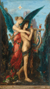 Ο Θάμυρις παίζει τη λύρα του σ’ ένα βράχο και πίσω του 2 Μούσες