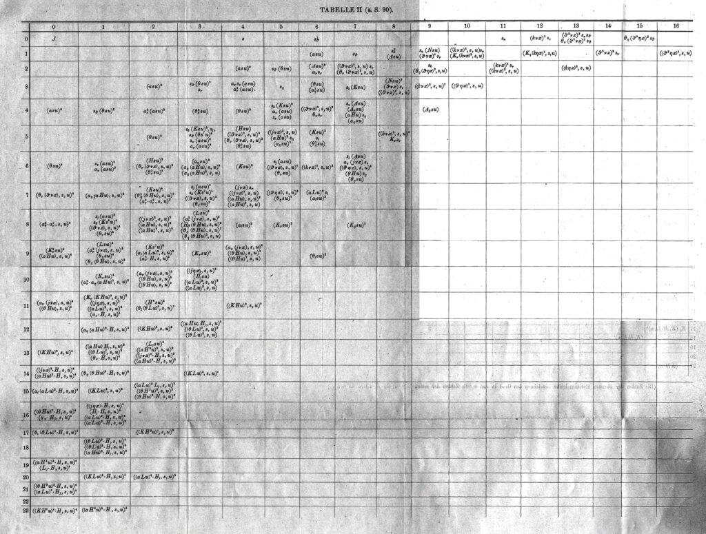 —-Στη διατριβή της Nούτερ σχετικά με την αμετάβλητη θεωρία υπάρχει πίνακας που συγκεντρώνει 202 από τις 331 σταθερές των 3μερών πολυκεντρικών μορφών. Αυτές οι μορφές ταξινομούνται σε 2 μεταβλητές x και u. Η οριζόντια κατεύθυνση του πίνακα παραθέτει τις σταθερές σε αύξουσα ως προς x, ενώ η κατακόρυφη απαριθμεί σε αύξουσα ως προς u.