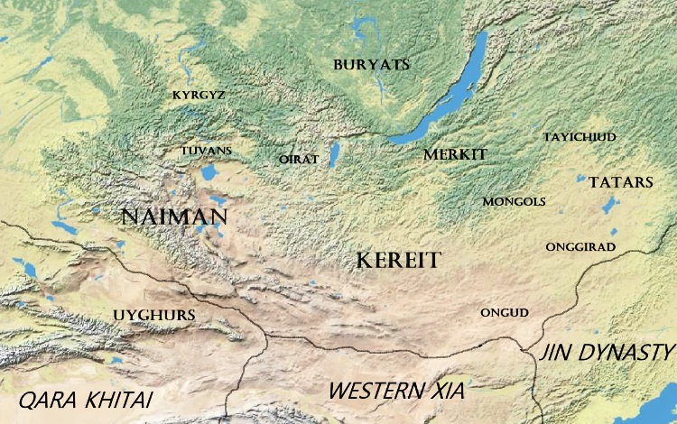 Οι Μογγόλοι ήταν επιδρομείς στη στέππα. Ήτανε κυνηγοί από τη πολύ βόρεια γη των λιμνών και των δασών, όπου αρχικά ζούσανε σε προσωρινές κωνικές σκηνές φτιαγμένες από φλοιό δέντρων. Στη διάρκεια των γενεών είχανε σταδιακά μετακινηθεί από τα δάση στη περιοχή του βουνού Burkhan Khaldun, στη πηγή των ποταμών Onon και Kherlen στη βόρεια κεντρική περιοχή της σύγχρονης Μογγολίας. Όταν το κυνήγι ήτανε κακό, απομακρύνανε τις φυλές που εξέτρεφαν ζώα, κλέβοντας το ζώα τους, τις γυναίκες κι οτιδήποτε άλλο μπορούσανε, προτού να επιστρέψουνε στην ασφάλεια των ορεινών κρησφυγέτων τους. Οι παλαιότερες τουρκικές φυλές των στεππών βοσκούσανε τα ζώα τους εδώ και πολλούς αιώνες κι υποτιμούσανε τους πρωτόγονους τους Μογγόλους, αντιμετωπίζοντας τους σαν υποτελείς και περιμένοντάς τους να προσφέρουνε δώρα, γούνες και θηράματα. Βρίσκανε τους Μογγόλους μερικές φορές χρήσιμους ως πολεμιστές για να τους βοηθήσουνε σε μιαν επιδρομή ή στη φύλαξη των ζωντανών τους και μερικές φορές έκλεβαν τις γυναίκες τους. Συνολικά, ωστόσο, οι εξελιγμένες φυλές των Τατάρων, οι Ναϊμάν κι οι Κερεϊντ τους περιφρονούσανε.