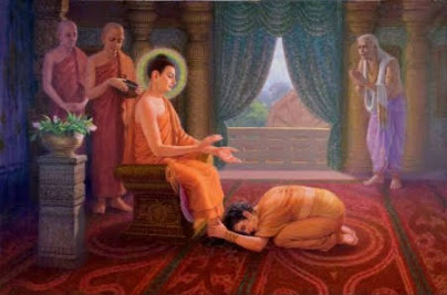 -“Θα πάω εκεί“, είπε ο Βούδδας και δίνοντας το μπωλ του στο βασιλιά, κίνησε για το δωμάτιό της. Όπως έβγαινε είπε στο βασιλιά: “Αφήστε τη να με σέβεται, ή ό,τι της αρέσει. Μη της λέτε τίποτα“.