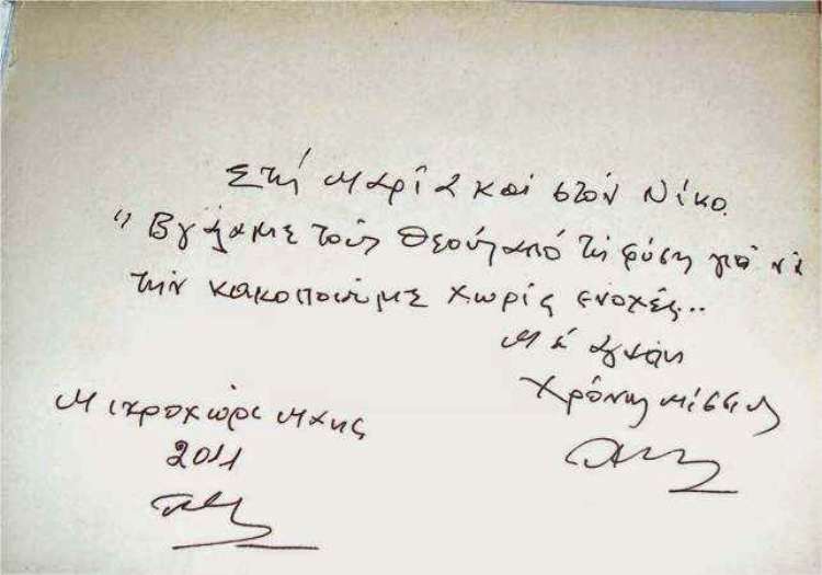 “Μόνο όταν ο θάνατος χτυπήσει κάποιο αγαπημένο μας πρόσωπο πονάμε, γιατί συνήθως σκεφτόμαστε πως θέλαμε να του πούμε τόσα σημαντικά πράγματα, όπως πόσο τον αγαπούσαμε, πόσο σημαντικός ήταν για εμάς … Όμως το αφήσαμε για αύριο … Για να πάμε που”;
