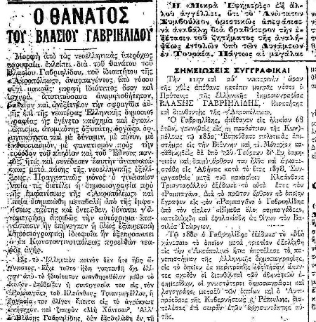 1ον. Ο Βλάσης Γαβριηλίδης (Επιβάτες Ανατολικής Θράκης/Πόλη, 1848 – Αθήνα, 11 Απρίλη 1920) ήταν Έλληνας λόγιος, δημοσιογράφος κι εκδότης. Θεωρείται πατέρας της δημοσιογραφίας της σύγχρονης Ελλάδας. Γεννήθηκε το 1848 στους Επιβάτες Ανατολικής Θράκης της Προποντίδας ή στη Πόλη κι ήτανε γιος του χρυσοχόου Γαβριήλ Γαβριηλίδη. Αποφοίτησε από τη Μεγάλη του Γένους Σχολή και σπούδασε πολιτικές επιστήμες και φιλοσοφία στο Πανεπιστήμιο Λειψίας, με υποτροφία του βαρώνου Γεωργίου Σίνα.