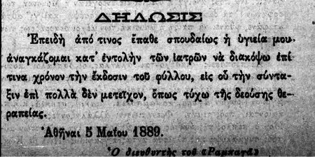 Ένα προφητικό έμμετρο για τον τότε Διάδοχο Κωνσταντίνο και τα λιβανωτά των μελλοντικών του υπηκόων προκάλεσε νέα δίωξη. Πρόβλεψε την ήττα του 1897 ακόμα και τον Εθνικό Διχασμό: Το 1887 ο Ρόκκος Χοϊδάς, γνωστός για τους αγώνες του εναντίον της Μοναρχίας προστέθηκε στη συντακτική ομάδα. Μαζί υπέστησαν νέες διώξεις για κείμενά του εναντίον του καθεστώτος. Στις 5 Μάη 1889 στη τελευταία σελίδα της εφημερίδας δημοσιεύεται το παρακάτω κείμενο: