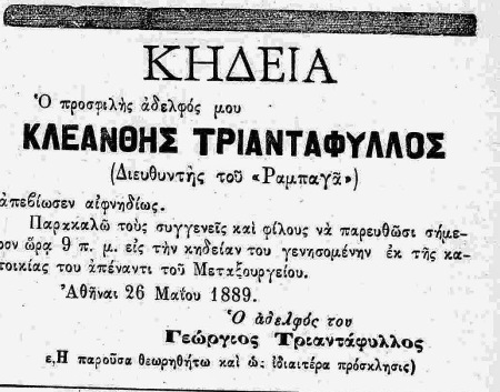 Μετά λίγες μόλις μέρες ο Κλεάνθης “Ραμπαγάς” Τριαντάφυλλος (1850 – 1889) φύτεψε μια σφαίρα στ’ όνειρό του. Στις 25 Μάη, με κλονισμένη υγεία και τα νεύρα σε κακή κατάσταση, μετά τη τελευταία πολύμηνη φυλάκισή του που ‘χε καταδικαστεί -για μίαν ακόμα φορά- λόγω της αρθρογραφίας και των ποιημάτων του που δημοσίευε στο δημοφιλές σατιρικό περιοδικό του που εστρέφετο κατά της βασιλείας, της αυλής και της κυβέρνησης, πιστός στα δημοκρατικά ιδεώδη και τις ανθρωπιστικές ιδέες. Επιθυμώντας να μεταβεί για θεραπεία στην Γαλλία κι αδυνατώντας να συγκεντρώσει τα απαραίτητα για το ταξίδι χρήματα. Με άθλια οικονομικά, έχοντας πουλήσει τα έπιπλά του, και μη βρίσκοντας συμπαράσταση από τους παλιούς του φίλους που τον είχαν εγκαταλείψει σχεδόν όλοι. Απογοητευμένος από την στάση τους κι όντας σε ηθικό αδιέξοδο. Όπως ανέφερε ο Στέφανος Ξένος στην νεκρολογία του για τον αυτόχειρα: “Παραπονιόταν ότι έχασε τη πέννα του, δεν μπορούσε να γράψει ούτε 2 γραμμές, είχε τρομερούς κεφαλόπονους, η όρασίς του εθαμβούτο, δεν μπορούσε να δει μακρυά, ακόμα και να περπατούσε δεν μπορούσε ούτε σε μικρή απόσταση. Δηλαδή είχε καταντήσει ένα σωματικό συντρίμμι, αληθινό ράκος“.