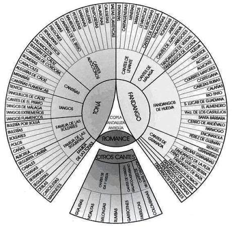 Το fandango, το οποίο τον 17ο αι. ήτανε το πιο διαδεδομένο τραγούδι και χορός σ’ όλη την Ισπανία, τελικά κατέληξε να παράγει τοπικές και περιφερειακές παραλλαγές, ειδικά στη Huelva. Στην Alta Andalucía και στις παραμεθόριες περιοχές, οι fandangos συνοδεύονταν με τη bandola, όργανο που συνοδεύονταν ακολουθώντας κανονικό ρυθμό που επέτρεπε το χορό και που από το όνομά του το στυλ αναφέρεται ως “εγκαταλελειμμένο”. Έτσι προέκυψαν τα fandangos της Lucena, οι κηφήνες του Puente Genil, οι πρωτόγονες malagueñas, οι rondeñas, οι jaberas, οι jabegotes, οι verdiales, οι chacarrá, οι granaína, οι taranto κι οι taranta. Λόγω της επέκτασης των Sevillanas στη Baja Andalusia, το fandango έχασε σταδιακά το ρόλο του ως υποστήριξη για το χορό, που επέτρεψε στον τραγουδιστή να λάμψει και να λευτερωθεί, δημιουργώντας πλήθος fandangos προσωπικής δημιουργίας τον 20ό αι. Ομοίως, χιλιάδες Ανδαλουσιανοί αγρότες, ειδικά από τις επαρχίες της Αν. Ανδαλουσίας, μετανάστευσαν στις περιοχές εξόρυξης Murcian, όπου εξελίχθηκαν οι τάραντος και οι τάραντα. Το Tarante de Linares, εξελίχθηκε στα ορυχεία της Ένωσης, της Καρθαγένης και της Λεβαντίκας. Την εποχή των cafés cantantes, μερικά απ’ αυτά τα cantes διαχωρίστηκαν από το χορό κι απέκτησαν ελεύθερο ρυθμό, που επέτρεψε στους ερμηνευτές να επιδειχθούν. Ο μεγάλος υποστηρικτής αυτής της διαδικασίας ήταν ο Antonio Chacón, που ανέπτυξε πολύτιμες εκδόσεις malagueñas, granainas και cantes mineros.
