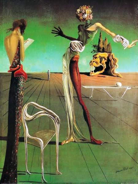 (Η Γυναίκα αυτή, ανθίζει, ωστόσο υπάρχει κι η απέναντι, που μελετά με ξέπλεκα μαλλιά και μια μονη καρέκλα, ένα τραπέζι με μια πέτρα πάνω του και μια ερημειά -όχι δεν είναι ανορθογραφία- ενώ πέρα στο βάθος το θηρίο-κάστρο καραδοκεί με ανοιγμένο το στόμα. Νομίζω δεν μπορεί κανείς να προσθέσει κάτι άλλο, σε κάτι τόσο κατάφωρα εύγλωττο!)