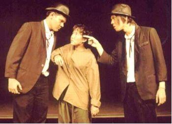 Βλαντ. Δείξε μου πάντως. (ο Εστρ ξεσφίγγει τη ζώνη και το παντελόνι του που ‘ναι μεγάλο, πέφτει στους αστραγάλους. κοιτάνε τη ζώνη). Μπορεί να γίνει θηλειά, αλλά θα ‘ναι αρκετά γερή;