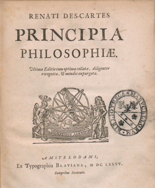 1644. Principia philosophiae (Αρχαί Φιλοσοφίας). Γράφτηκε ν’ αντικαταστήσει τα αριστοτελικά κείμενα των πανεπιστημίων