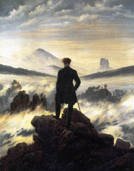 Ένας μοναχικός περιπατητής, με την πλάτη στραμμένη σε μας, ο οποιοσδήποτε άνθρωπος, ατενίζει από ψηλά τα βουνά. Τα στοιχεία του ρομαντισμού αυτού του πίνακα είναι η ονειροπόληση, η μοναξιά και η μοναχικότητα, η αδύναμη, μες στην απέραντη δύναμη της φύσης αλλά ηρωική μορφή του ανθρώπου. Τα περιγράμματα, δείχνουν να χάνονται στην ομίχλη, εστιάζουμε στη σκιά και στη κίνηση (μαλλιά, σύννεφα). Ο περιπατητής θέλει να διευρύνει τους ορίζοντές του και ν’ ανακαλύψει καινούριους κόσμους, να υπερβεί τις ως τώρα δυνατότητές του. Τα σύννεφα, που κρύβουνε κάποιες από τις κορφές, δείχνουνε πως όσο ψηλά και να φτάσει κανείς δεν μπορεί να τα δει όλα, ίσως πως ο αγώνας για τη γνώση είναι συνεχής.