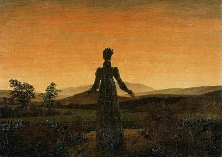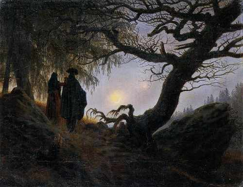 2. Στο έργο του “Άνδρας & Γυναίκα Ατενίζοντας Το Φεγγαρόφωτο” (1818/1824), οι 2 ρεμβαστές δε διαφέρουνε διόλου απ’ τα βράχια και το ξερριζωμένο δέντρο πλάι. M’ όλο που δεν έχουνε καμμίαν έκφραση η λέξη που τους περιγράφει καλλίτερα, αυτούς κι όλο το γερμανικό Ρομαντισμό, στη ζωγραφική, στη ποίηση, στη μουσική και στη φιλοσοφία, είναι λαχτάρα. H λαχτάρα για το άγνωστο, το ασύλληπτο, που κρύβεται είτε στη Φύση ή κάπου στο άχρονο παρελθόν πέραν του κόσμου τούτου. Αυτό στη ζωγραφική μπορεί να συμβολίζεται με τη μορφή ενός δάσους, ενός δέντρου μόνου, ενός βράχου, ενός σύννεφου ή της απέραντης θάλασσας. Μερικές φορές τα σύμβολα αποκτούνε θρησκευτική χροιά, όπως π.χ. στο Φρήντριχ όταν εμφανίζεται ένα παλιό παρεκκλήσι ερειπωμένο, μια γοτθική αψίδα ή ένας σταυρός στο βουνό. Αλλά δεν είναι εντελώς απαραίτητα, αν κι οι Γερμανοί ρομαντικοί είχαν ένθερμο θρησκευτικό ζήλο, λαχτάρα προς την αθωότητα του κόσμου της Καινής Διαθήκης γι’ αυτό κι ορισμένοι τους αυτοαποκαλούνται Ναζαρηνοί.