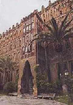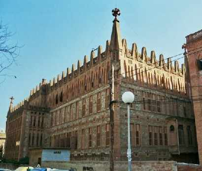 Το κτίριο έχει ένα εκτεταμένο ισόγειο και δυο πατώματα και στους στύλους της πρόσοψης υψώνεται ένας πύργος στηριγμένος και που δεσπόζει σ’ αυτό. Είναι χτισμένο με τούβλα και στολίζεται με κεραμικά σε λωρίδες και τα κιγκλιδώματα των πεζουλιών και των μπαλκονιών είναι από σφυρήλατο σίδηρο. Αυτό το υλικό κάνει να φεγγοβολά το κτίριο από το ηλιακό φως κι ειδικότερα ο πύργος.