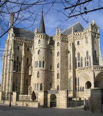 Βρίσκεται στη Plaza de Eduardo de Castro στη Castilla-Leon, στην Astorga (Αστουρία). ‘Αλλο ένα κτίριο που ανέδειξε τον καταλανικό ρυθμό στο μέγιστο βαθμό. Είναι φτιαγμένο σ’ ένα σημείο με πολύ ανώμαλον έδαφος κι οι εργασίες του ξεκινήσανε το 1889 μέχρι που μια μεγάλη πυρκαγιά τις σταμάτησε, το 1893. Τη κατασκευή, ζήτησε ο Επίσκοπος Ταραγόνας, Grau, φίλος του Γκαουντί, που ήθελεν ένα νέο επισκοπικό κτίριο. Ο δημιουργός ήταν απασχολημένος με το Παλάσιο Γκουέλ στη Βαρκελώνη κι ήταν αδύνατον να ξεκίνησει για κεί. Για να τονε διευκολύνει ο Επίσκοπος, του ‘στειλε φωτογραφίες, σχέδια της περιοχής και πληροφορίες για το έδαφος. Εκείνος μελέτησε προσεκτικά τα στοιχεία, ετοίμασε τα σχέδιά του, έτσι ώστε να εναρμονιστεί το νέο κτίριο με το περιβάλλον του κι έδωσε το “καλώς έχει”, ώστε ο ευχαριστημένος Επίσκοπος να ξεκινήσει τις διαδικασίες για τις άδειες και τα λοιπά.