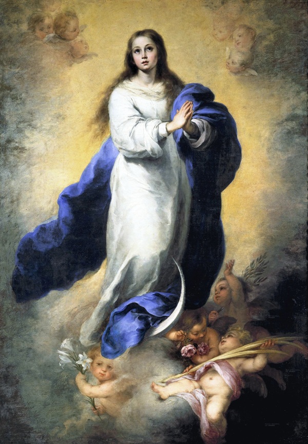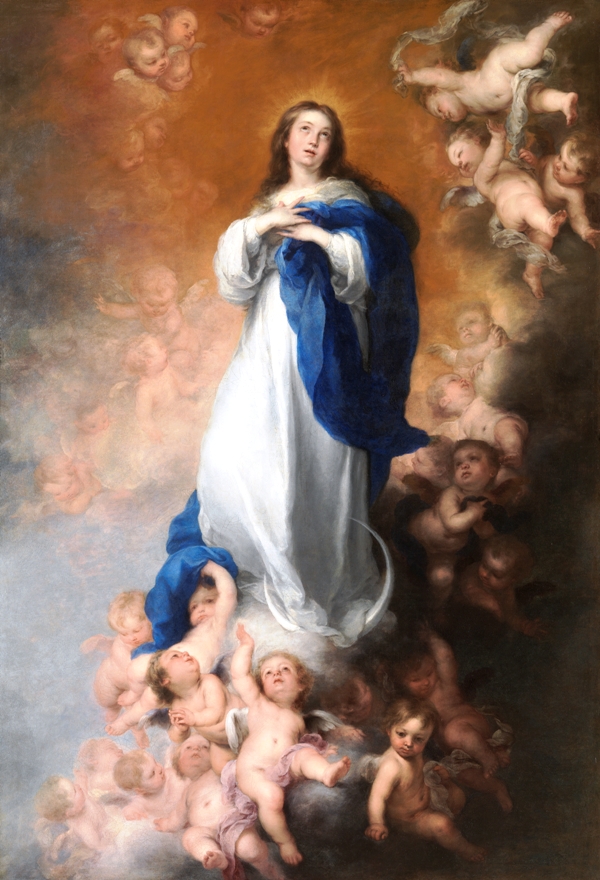 Η Άμωμη Σύλληψη της Santa María la Blanca αντιστοιχεί σε πρωτότυπο που δημιούργησε ο ζωγράφος γύρω στο 1660 ή λίγο αργότερα, χρόνια στα οποία ανήκει η λεγόμενη Άμωμη Σύλληψη του El Escorial (Museo del Prado), μία από τις πιο όμορφες και γνωστές από τον ζωγράφο, που χρησιμοποίησε εδώ εφηβικό μοντέλο, νεότερο από ό,τι στις άλλες εκδοχές του. Το κυματιστό προφίλ της μορφής, με τον μανδύα μόλις που αποσπάται από το σώμα σε διαγώνια κατεύθυνση, και η αρμονία των μπλε και λευκών χρωμάτων του φορέματος με το ασημί γκρι των σύννεφων κάτω από την ελαφρώς χρυσή λάμψη που περιβάλλει τη μορφή της Παναγίας, είναι χαρακτηριστικά που απαντώνται σε όλες τις μεταγενέστερες εκδοχές της μέχρι την τελευταία: η Άμωμη Σύλληψη των Σεβάσμιων, που ονομάζεται επίσης Άμωμη Σύλληψη Soult, που μπορεί να ‘χει ανατεθεί το 1678 από τον Justino de Neve για έναν από τους βωμούς του Hospital de los Venerables στη Σεβίλλη. Παρά το σημαντικό μέγεθός της, η Παναγία εμφανίζεται εδώ με μικρότερες διαστάσεις, καθώς ο αριθμός των μικρών αγγέλων που φτερουγίζουν χαρούμενα γύρω της αυξάνεται σημαντικά, προσδοκώντας τη λεπτή γεύση του ροκοκό. Βγήκε από την Ισπανία από τον στρατάρχη Soult, όταν θεωρήθηκε, σύμφωνα με τον Ceán Bermúdez, «ανώτερο απ’ όλους εκείνους που ‘χε στο χέρι του», αποκτήθηκε από το Μουσείο του Λούβρου το 1852 για 586.000 χρυσά φράγκα, το υψηλότερο ποσό που είχε καταβληθεί μέχρι τότε για πίνακα. Η επακόλουθη είσοδός του στο Μουσείο Πράδο προέκυψε ως αποτέλεσμα συμφωνίας που υπογράφηκε μεταξύ της ισπανικής κυβέρνησης και της γαλλικής κυβέρνησης του Πεταίν το 1940, όταν η εκτίμηση του ζωγράφου ήταν σε χαμηλή πτώση, ανταλλάσσοντας μαζί με την Κυρία του Έλτσε κι άλλα έργα τέχνης αντίγραφο του πορτραίτου της Μαριάνας της Αυστρίας από τον Βελάσκεθ, που τότε ανήκε στο Μουσείο Πράδο, που κείνη την εποχή θεωρούνταν η αρχική έκδοση του πορτραίτου.