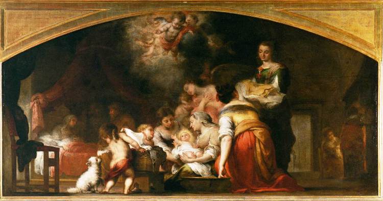 Από κείνο το έτος 1660 είναι επίσης από τα πιο σημαντικά και θαυμαστά έργα της παραγωγής του: η Γέννηση της Θεοτόκου στο Μουσείο του Λούβρου, ζωγραφισμένη για τη πάνω πόρτα του παρεκκλησίου της Μεγάλης Σύλληψης του καθεδρικού ναού της Σεβίλλης. Στο κέντρο, κάτω από μικρή έκρηξη δόξας, ομάδα μητέρων κι αγγέλων σε φθίνουσα σύνθεση χρεωμένη στο Ρούμπενς στροβιλίζονται ευτυχισμένοι γύρω από το νεογέννητο μωρό, από το οποίο προέρχεται προβολέας που φωτίζει έντονα το προσκήνιο κι υποβαθμίζεται προς το φόντο. Με αυτόν τον τρόπο δημιουργεί ατμοσφαιρικά εφέ στις πλευρικές σκηνές, πιο πίσω και με αυτόνομους προβολείς, που η Αγία Άννα εμφανίζεται στ’ αριστερά, σε κρεβάτι με ουρανό, αντιπαραβάλλοντας τον αμυδρό φωτισμό της με αυτόν της καρέκλας σε 1ο πλάνο με το φως και 2 κοπέλες δεξιά στεγνώνουν τις πάνες τους σε φωτιά τζακιού. Αυτή η προσεκτικά μελετημένη ιεραρχία των φώτων θυμίζει σε κριτικούς όπως ο Diego Angulo την ολλανδική ζωγραφική και συγκεκριμένα τη ζωγραφική του Rembrandt, που ο Murillo μπορεί να γνώριζε μέσω χαρακτικών ή ακόμα και μέσω της παρουσίας ορισμένων έργων του σε συλλογές της Σεβίλλης, όπως αυτή του Melchor de Guzmán, μαρκησίου του Villamanrique, που είναι γνωστό ότι είχε στη κατοχή του πίνακά του που εξέθεσε δημόσια το 1665 με την ευκαιρία των εγκαινίων της εκκλησίας της Santa Maria la Blanca.
