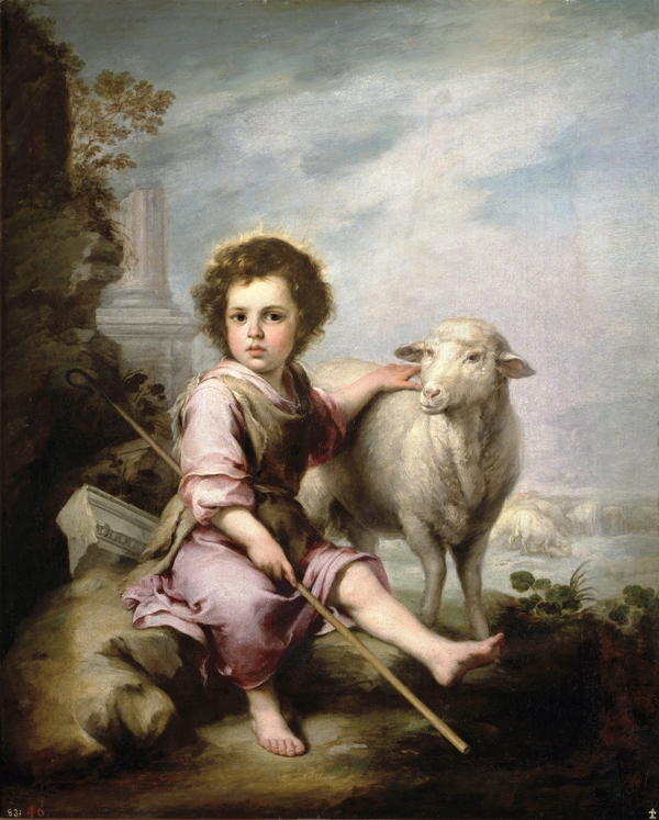 3 εκδοχές του παλιού θέματος του Καλού Ποιμένα, που εκτελείται από τον Murillo σε μια παιδική έκδοση, είναι γνωστές: αυτή που είναι ίσως η παλαιότερη από αυτές, αυτή στο Μουσείο Prado, ζωγραφισμένη γύρω στο 1660, δείχνει το Παιδί να στηρίζεται με το ένα χέρι στο χαμένο πρόβατο, όρθιο, κοιτάζοντας τον θεατή με έναν ορισμένο μελαγχολικό αέρα και καθισμένο σε ένα βουκολικό τοπίο κλασσικών ερειπίων. που το καθιστά μια αποτελεσματική λατρευτική εικόνα. Μια μεταγενέστερη εκδοχή, στο Λονδίνο, Lane Collection, με τον Ιησού να στέκεται επικεφαλής του ποιμνίου, αφήνει περισσότερο χώρο για το ποιμενικό τοπίο και το πρόσωπο του Παιδιού, τώρα κατευθυνόμενο προς τον ουρανό, κερδίζει σε εκφραστικότητα. Ο συνεργάτης του στο παρελθόν, ο Άγιος Ιωάννης και το Αρνί του Λονδίνου, στην Εθνική Πινακοθήκη, στον οποίο ο μικρός Βαπτιστής εμφανίζεται με χαμογελαστό πρόσωπο ενώ αγκαλιάζει το αρνί με παιδική φρεσκάδα, τράβηξε τη προσοχή του Gainsborough που μπόρεσε ν’ αποκτήσει αντίγραφο και να εμπνευστεί απ’ αυτό για το Αγόρι με σκύλο από τη συλλογή Alfred Beit. Η τελευταία εκδοχή αυτού του θέματος, δουλεμένη με αξιοσημείωτη ευκολία στο πινέλο κι απαλά χρώματα, ανήκει ήδη στα τελευταία χρόνια του ζωγράφου, με πιο έντονα γλυκιά και λεπτή αίσθηση ομορφιάς. Τα Παιδιά του Κελύφους στο Μουσείο του Πράδο, όπου το Παιδί Ιησούς και ο Άγιος Ιωάννης εμφανίζονται μαζί σε μια στάση παιχνιδιού, είναι, όπως κι οι πριν, λατρευτική εικόνα που στοχεύει σε απλή ευσέβεια, αλλά σερβίρεται με εκλεπτυσμένη εικονογραφική τεχνική, εξαιρετικά δημοφιλή.