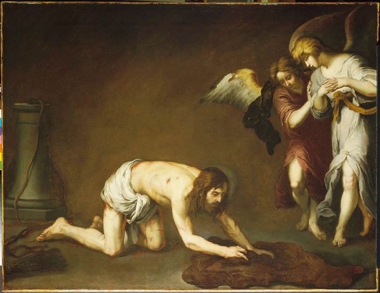 Σχετικά με αυτό, το θέμα του Χριστού στη στήλη με τον Άγιο Πέτρο σε δάκρυα, που μας καλεί να στοχαστούμε σχετικά με την ανάγκη για μετάνοια και το μυστήριο της συγχώρεσης, έχει στην παραγωγή του Murillo ένα αξιοσημείωτο παράδειγμα για τον πελάτη για τον οποίο ζωγραφίστηκε, Canon Justino de Neve, και για το πλούσιο και σπάνιο υλικό που χρησιμοποιείται ως στήριγμα: φύλλο οψιδιανού από το Μεξικό. Το μικρό κομμάτι αναφέρθηκε στον κατάλογο των αγαθών του Neve που έγινε κατά το θάνατό του ως ζευγάρι με μια προσευχή στον κήπο ζωγραφισμένη στο ίδιο υλικό και τα δύο αποκτήθηκαν στη δημοπρασία του από τον χειρουργό Juan Salvador Navarro, από την ιδιοκτησία του οποίου πέρασαν σε εκείνη του Nicolás de Omazur.