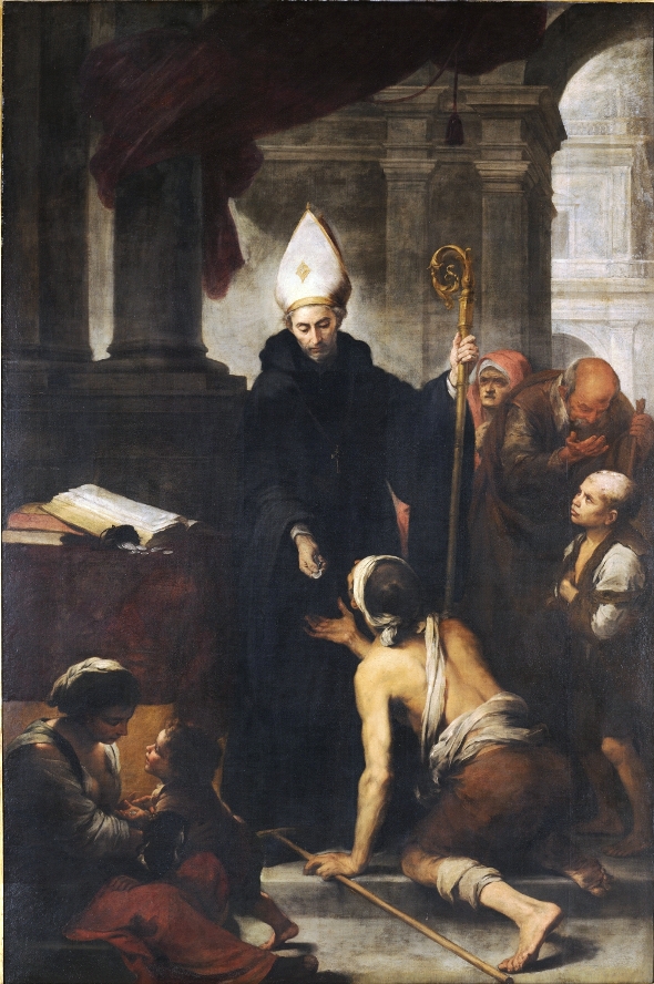 Ο Santo Tomás de Villanueva, ο πίνακας που ο ζωγράφος ονόμασε “καμβά του”, που αρχικά βρισκότανε στο 1ο παρεκκλήσι στα δεξιά, αποτελεί παράδειγμα του βαθμού δεξιοτεχνίας που πέτυχε ο ζωγράφος σ’ αυτή τη σειρά. Ο Tomás de Villanueva, αν κι Αυγουστινιανός κι όχι Φραγκισκανός, είχε πρόσφατα αγιοποιηθεί από τον Αλέξανδρο Ζ’ κι ως αρχιεπίσκοπος της Βαλένθια είχε ξεχωρίσει για το πνεύμα ελεημοσύνης του, που ο Murillo τονίζει τοποθετώντας τον περιτριγυρισμένο από ζητιάνους που τους βοηθά δίπλα σε τραπέζι με ανοιχτό βιβλίο, που ‘χει εγκαταλείψει, να δηλώσει με αυτόν τον τρόπο ότι η θεολογική επιστήμη Χωρίς φιλανθρωπία δεν είναι τίποτα. Η σκηνή διαδραματίζεται σ’ εσωτερικό με νηφάλια κλασσική αρχιτεκτονική κι αξιοσημείωτο βάθος που χαρακτηρίζεται από την εναλλαγή φωτισμένων και σκιασμένων χώρων. Μνημειώδης κίονας στο μεσαίο επίπεδο ενάντια στο φως δημιουργεί φωτεινό φωτοστέφανο γύρω από το κεφάλι του αγίου, που το ύψος αυξάνεται από τον ανάπηρο ζητιάνο που γονατίζει μπρος του, με μελετημένη συντόμευση της γυμνής πλάτης του. Οι αντίθετες ψυχολογίες των ζητιάνων που διασώζονται φαίνονται εξίσου μελετημένες, από τον καμπουριασμένο γέρο που φέρνει το χέρι του στα μάτια του, με μια χειρονομία έκπληξης ή δυσπιστίας, τη γριά που κοιτά με σκυθρωπή όψη και το χρωματισμένο αγόρι που περιμένει παρακαλώντας, μέχρι το παιδί που στη κάτω αριστερή γωνία του καμβά και τονίζεται στο φως, δείχνει στη μητέρα του με λαμπρή χαρά τα νομίσματα που ‘χει λάβει.