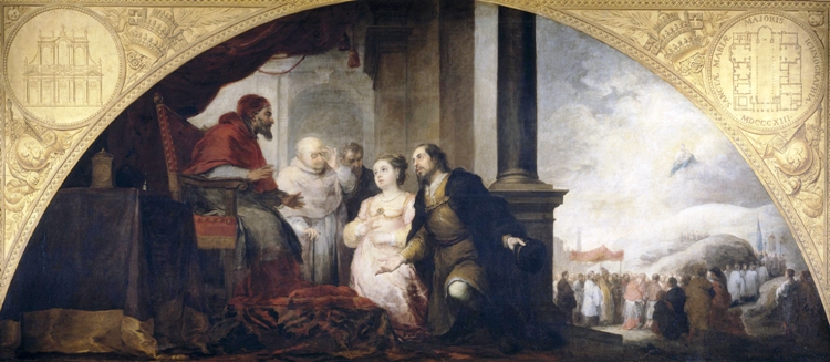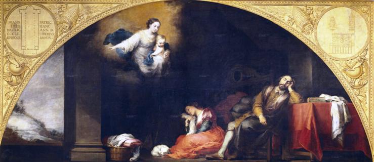 Ειδικά τα 2 πρώτα είναι αριστουργηματικά έργα. Στο όνειρο του πατρίκιου Juan και της συζύγου του Murillo αντιπροσωπεύει τη στιγμή που, στα όνειρα, η Παναγία εμφανίζεται σ’ αυτούς τον μήνα Αύγουστο για να τους ζητήσει την αφιέρωση ναού στον τόπο που θα δουν να εντοπίζεται με χιόνι στον λόφο Esquiline. Αντί να τους δείξει να κοιμούνται στο κρεβάτι, ο Murillo τους φαντάζεται να κατακλύζονται από τον ύπνο, κείνος ξαπλωμένος στο τραπέζι σκεπασμένο από κόκκινο χαλί, που πάνω στηρίζεται το χοντρό βιβλίο που διαβάζει και κείνη σε μαξιλάρι, σύμφωνα με το έθιμο της εποχής, με το κεφάλι της να γέρνει πάνω στη διακοπτόμενη εργασία. Ακόμα και λευκός σκύλος κοιμάται στροβιλιζόμενος γύρω από τον εαυτό του. Η φθίνουσα σύνθεση ενισχύει την αίσθηση χαλάρωσης. Η κατήφεια που εισβάλλει στη σκηνή, σπασμένη από το φωτοστέφανο που περιβάλλει τη Μαρία με το Παιδί, διαφοροποιείται από τα φώτα που αναδεικνύουν διακριτικά κάθε λεπτομέρεια της σύνθεσης και δημιουργούν, με τη ρευστή και θολή επεξεργασία των περιγραμμάτων, το χώρο που οι φιγούρες βρίσκονται ήρεμα.