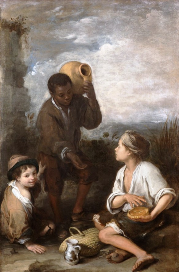 Πίνακες όπως το Δύο παιδιά τρώνε από κουτί φαγητού και τα παιδιά που παίζουν ζάρια -παιχνίδι που αποδοκιμάζεται απ’ τους ηθικολόγους- κι οι 2 σώζονται στη γκαλερί τέχνης του Μονάχου, αν και μπορεί επίσης να εμπνέονται από παροιμίες ή ιστορίες picaresque, που δεν έχουν εντοπιστεί, δεν φαίνεται να ανταποκρίνονται σε καμμία άλλη πρόθεση παρά να απεικονίσουν με φιλικό τόνο ομάδες παιδιών που εκφράζουν τη χαρά τους για τα τυχερά παιχνίδια ή την κατανάλωση γλυκών. και ότι είναι σε θέση να επιβιώσουν με τους περιορισμένους πόρους τους χάρη στη ζωτικότητα που τους δίνει η δική τους νεολαία. Παρόμοιου τόνου, αλλά ίσως με πιότερο περιεχόμενο πλοκής, είναι τα 2 που διατηρούνται στην Dulwich Picture Gallery: Πρόσκληση στο παιχνίδι της μπάλας με ένα φτυάρι, το οποίο αντικατοπτρίζει τις αμφιβολίες του παιδιού που αποστέλλεται για να εκτελέσει δουλειά όταν άλλο, άτακτο, το καλεί να συμμετάσχει στο παιχνίδι κι αυτό που ονομάζεται 3 αγόρια ή 2 μικροί παίκτες γκολφ και λίγο μαύρο, που το μικρό ανέκδοτο επιτρέπει στο ζωγράφο ν’ αντιμετωπίσει διάφορες ψυχολογικές αντιδράσεις σε απροσδόκητο γεγονός: μαύρο αγόρι με μια στάμνα στον ώμο του, που ο Murillo θα μπορούσε να απεικονίσει τον Martín, τον σκουρόχρωμο μαύρο σκλάβο του, γεννημένο γύρω στο 1662, φτάνει εκεί όπου 2 άλλα αγόρια είναι έτοιμα να φάνε σνακ και με φιλική χειρονομία τους ζητά κομμάτι από το κέικ που πρόκειται να φάνε κι αυτός αντιδρά διασκεδαστικά, ενώ αυτός που ‘χει τη τούρτα προσπαθεί να τη κρύψει στα χέρια του με φοβισμένη χειρονομία.