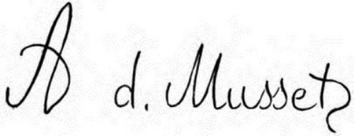 Η ιστορία του διάσημου έρωτά του με τη Τζορτζ Σαντ το 1833–1835 αφηγείται από τη σκοπιά του στο αυτοβιογραφικό του μυθιστόρημα La Confession d’un Enfant du Siècle (Η εξομολόγηση ενός παιδιού του αιώνα) (1836), που ‘γινε ταινία του 1999, Παιδιά του Αιώνα και ταινία του 2012 κι αφηγείται από τη δική της οπτική γωνία στο Elle et lui (1859). Το Nuits (Nights) (1835–1837) του Musset παρακολουθεί τη συναισθηματική αναταραχή της αγάπης του για τη Sand από τη πρώιμη απόγνωση μέχρι τη τελική παραίτηση. Πιστεύεται επίσης ότι είναι ο ανώνυμος συγγραφέας του Gamiani, ή Two Nights of Excess (1833), λεσβιακού ερωτικού μυθιστορήματος που φημολογείται ότι είχε ως πρότυπο τη Sand.